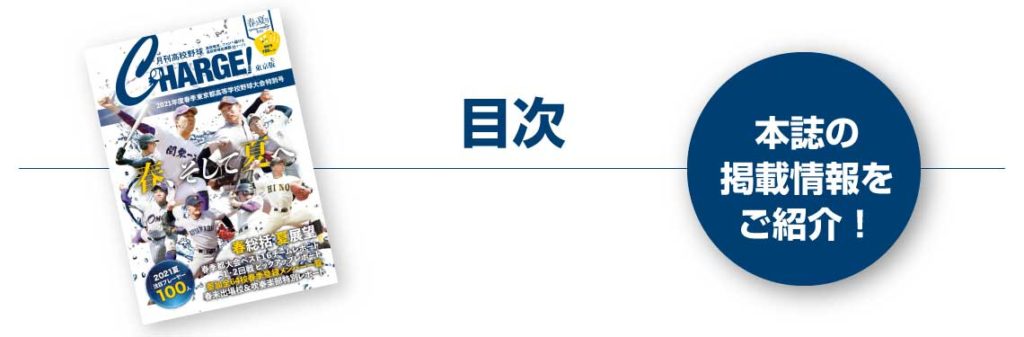 月刊高校野球CHARGE!2021年春・夏号 好評発売中!! その戦いは尊い。 4月下旬都内には再び緊急事態宣言が発出された。 春季都大会決勝は延期になり、都立高校では練習も休止になった。 それでも各チームは制限下でできることに取り組む。 球児は逆境に屈しない。 「春、そして夏へ」 今私たちにできること、紙でしか残せない思い出を。 オンラインストアにて発売!! 定価:1,680円(税込)+送料 いますぐ購入する 2021夏 東西東京大会注目プレーヤー100人 東東京 関東一 市川祐関東一 初谷健心 関東一 楠原悠太二松学舎大附 秋山正雲 二松学舎大附 関遼輔 二松学舎大附 永見恵多 大森学園 松本哲郎 大森学園 八田成 大森学園 半田夢叶 日大豊山 荒木慈安日大豊山 玉井皓一朗日大豊山 飯島渉太東亜学園 阿部太一朗帝京 武藤闘夢帝京 安川幹大小山台 木暮瞬哉小山台 森村輝修徳 床枝魁斗修徳 間島玉喜東海大高輪台 的野健太東海大高輪台 小笹敦史岩倉 古坂虎汰朗岩倉 髙畠雅裕共栄学園 東野雄志共栄学園 山崎航立正大立正 山本右京立正大立正 山本紘正実践学園 菅沼麟太郎実践学園 吉村昇摩東京実業 十鳥真乙東京成徳大 須藤竜童東京成徳大 岩井拓巳城東 林平太郎城東 佐藤タイラー郁文館 甲斐一馬郁文館 郭家樺目黒日大 當山竜祥目黒日大 落合悠太目白研心 各務功太目白研心 安保優太郎城北 島田開斗城北 加藤大祐青山学院 中山脩悟小岩 高草優心小岩 鎌田翔吾高島 角津田夢叶江戸川 白川秀英日体大荏原 宇藤武蔵豊南 石飛佑真足立新田 古川亘大 西東京 八王子 羽田慎之介八王子 新田優樹八王子 安藤健東海大菅生 本田峻也東海大菅生 堀内沖永日大三 宇山翼日大三 山岡航大日大三 土屋マックス清文明大中野八王子 井上仁明大中野八王子 築地星流国学院久我山 高橋風太国学院久我山 内山凛日野 木下孔晴日野 樋口恵斗日野 廣岡太平日大二 藤井道万日大二 岩田侑真日大鶴ヶ丘 山本輝大日大鶴ヶ丘 黒須真太朗早大学院 田村康介日本学園 浅井颯斗日本学園 澤田夕輝国士舘 清水武蔵国士舘 折田大和創価 高沢春佑創価 小松稜平桜美林 中脇秀桜美林 羽田翔世佼成学園 福岡元翔佼成学園 上原諄早稲田実 田和廉早稲田実 清宮福太郎豊多摩 外内滉大片倉 角田樹一希拓大一 西田凛太郎世田谷学園 建守伯世田谷学園 石郷岡一汰工学院大附 島﨑󠄁龍斗工学院大附 伊柳勇知日大櫻丘 佐藤有真八王子北 上野竜輝八王子北 伊藤智哉明法 牧嶋葵向明法 京嶋大和東大和 川島慶土千歳丘 船山友征駒大 竹内和将八王子実践 高野哲平光丘 前田頼人聖パウロ学園 眞野文太 東東京 関東一 市川祐関東一 初谷健心関東一 楠原悠太二松学舎大附 秋山正雲二松学舎大附 関遼輔大森学園 松本哲郎大森学園 八田成日大豊山 荒木慈安日大豊山 玉井皓一朗東亜学園 阿部太一朗帝京 武藤闘夢帝京 安川幹大小山台 木暮瞬哉小山台 森村輝修徳 床枝魁斗修徳 間島玉喜東海大高輪台 的野健太東海大高輪台 小笹敦史岩倉 古坂虎汰朗岩倉 髙畠雅裕共栄学園 東野雄志共栄学園 山崎航立正大立正 山本右京立正大立正 山本紘正実践学園 菅沼麟太郎東京実業 十鳥真乙東京成徳大 須藤竜童城東 林平太郎城東 佐藤タイラー郁文館 甲斐一馬目黒日大 當山竜祥目黒日大 落合悠太目白研心 各務功太城北 島田開斗青山学院 中山脩悟小岩 高草優心高島 角津田夢叶江戸川 白川秀英足立新田 古川亘大.etc 西東京 八王子 羽田慎之介東海大菅生 本田峻也日大三 宇山翼八王子 安藤健明大中野八王子 井上仁明大中野八王子 築地星流国学院久我山 高橋風太国学院久我山 内山凛日野 木下孔晴日野 樋口恵斗日大二 藤井道万日大二 岩田侑真日大鶴ヶ丘 山本輝大日大鶴ヶ丘 黒須真太朗早大学院 田村康介日本学園 浅井颯斗日本学園 澤田夕輝国士舘 清水武蔵国士舘 折田大和創価 高沢春佑桜美林 中脇秀桜美林 羽田翔世佼成学園 福岡元翔早稲田実 田和廉早稲田実 清宮福太郎豊多摩 外内滉大片倉 角田樹一希拓大一 西田凛太郎世田谷学園 建守伯工学院大附 島﨑󠄁龍斗八王子北 上野竜輝八王子北 伊藤智哉明法 牧嶋葵向東大和 川島慶土千歳丘 船山友征聖パウロ学園 眞野文太.etc オンラインストアにて発売!! 定価:1,680円(税込)+送料 いますぐ購入する 2021年度春期東京都高等学校野球大会特別号本誌内容 ー春季都大会ベスト16チームレポートー 【決勝進出校】 関 東 一 日 大 三 【ベスト4】 東海大菅生 二松学舎大附 【ベスト8】 八 王 子 国学院久我山 大 森 学 園 明大中野八王子 【ベスト16】 小 山 台 専 大 附 創 価 日 本 学 園 佼 成 学 園 日 大 豊 山 日 野 日大鶴ケ丘 ー1・2回戦ピックアップゲームー 春大会の中でも注目度が高いカードを徹底レポート。「早稲田実VS国学院久我山」「世田谷学園VS小山台」「国士館VS明大中野八王子」など1・2回戦から7カードを徹底レポートしています。見ごたえのあるページとなっています。 【1回戦】 世田谷学園 VS 小山台 早稲田実 VS 国学院久我山 日本学園 VS 帝京 岩倉 VS 実践学園 国士館 VS 明大中野八王子 【2回戦】 修徳 VS 佼成学園 共栄学園 VS 関東一 ーSummer Story 2021