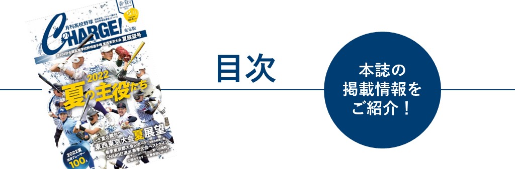 CHARGE!取材陣が秋季・春季東京大会、そして年間を通じた学校取材のもとに、第104回全国高等学校野球選手権大会東西東京大会での活躍が期待される注目選手東西各50人をピックアップ。ポジション順にカード形式でご紹介。