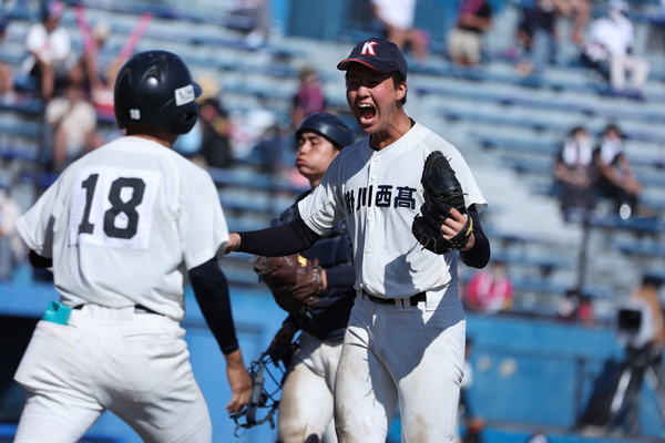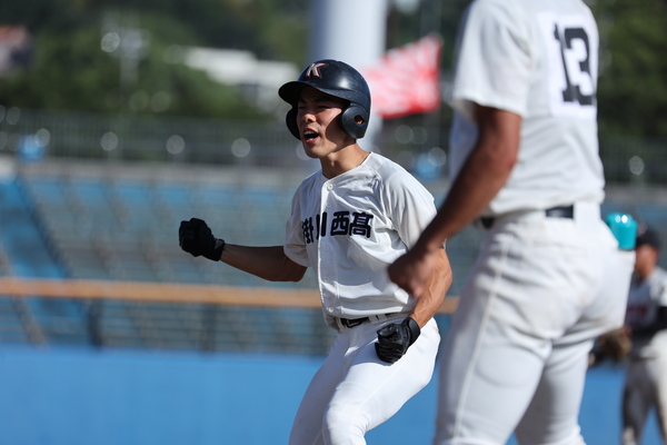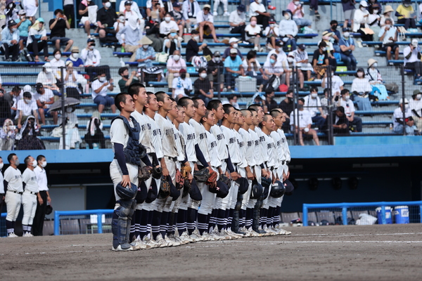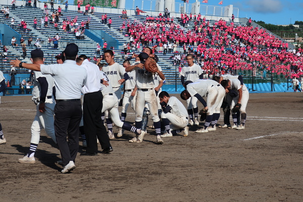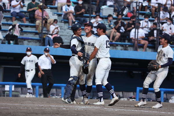 7回までゼロ行進が続いた両チーム。8回裏に1点を失い、9回表は2死まで追い込まれて万事休すかと思われた。けれども、ここから意地を見せる。 安打と四球で繋いで満塁のチャンスを掴み、5番・山本柊太(3年=投手、内野手)の走者一掃のタイムリーで試合をひっくり返した。「名門対決」を劇的な逆転で制し、草薙球場に詰めかけた大応援団と喜びを分かち合った。
