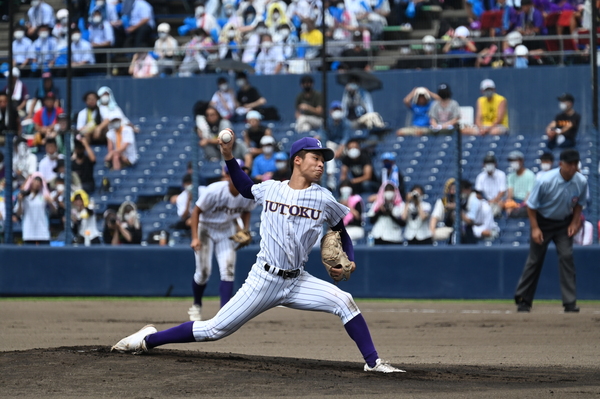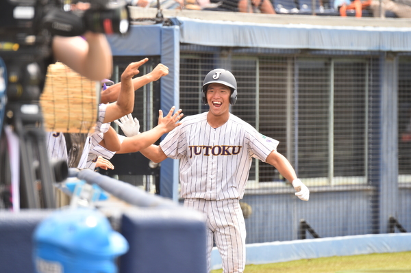 一気呵成。準々決勝で前橋育英、準決勝で桐生第一に競り勝ち決勝へ進出した樹徳は、決勝でも勢いもろとも戦闘態勢に入った。初回に舘野優真のタイムリーで1点を先制すると、1死満塁から森颯良が走者一層の三塁打。相手の送球ミスに乗じて自らも生還して一挙5点を奪った。1回を終えて5対0。樹徳の迫力に、球場全体がどよめく。樹徳は3回裏にスクイズで1点を追加。ゲームの主導権を奪った。