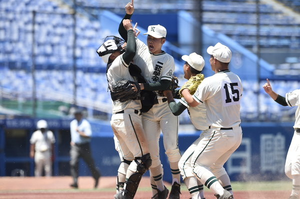 バットでも貢献したエース辻は、抜群の制球力を前面に出したピッチングで6回まで被安打3四死球0の無失点。7回に長短打を浴びて1失点した時点で、マウンドを2年生右腕・重川創思に譲ったが、大舞台でスターターの役割を果たした。ストッパータイプの重川は威力あるストレートを武器に後続を断ち、追加点を与えなかった。5対1のスコアで迎えた9回、重川が最後の打者を三振に打ち取り、ゲームセット。選手たちはマウンドへ集まり勝利の咆哮を挙げた。市原勝人監督は「辻から重川への継投がこのチームの必勝パターン。選手たちは、大会を通じて粘り強く戦ってくれた」と語った。二松学舎大附は昨夏の選手権、今春のセンバツに続いて夏・春・夏の3季連続甲子園出場。力強さと巧さを備えたチームは、揺るぎない強さを体現して優勝旗をつかんだ。